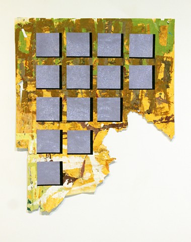 acrylic, collage, gesso, paste, baking soda, non-skid tape on found paper